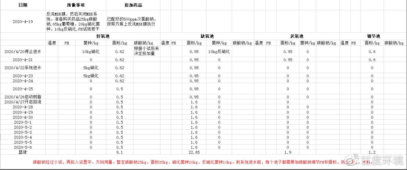 第一天 2020/4/20 好氧池投加面粉620g,投加10kg硝化细菌,缺氧池,厌氧池、投加950g面粉,调节池投加720g面粉,维护COD在200,同时投加碳酸钠调节这三个池子PH至7.5,防止调节池腐化、发臭,使厌氧池和缺氧池细菌保持活性。记录PH,温度(设备埋在地下,水温通常比气温高4-5℃)。